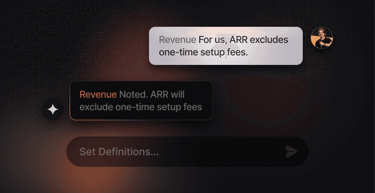 Your definitions, enforced everywhere. Lopus doesn't guess what "revenue" means. You define it once and that definition governs every query.
